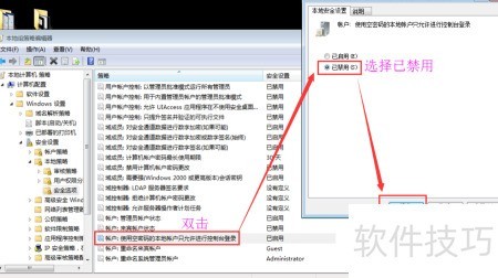 7、 进入安全选项中的组策略设置,定位到账户:使用空密码的本地账户只允许进行控制台登录,将其双击打开后选择禁用即可完成配置。