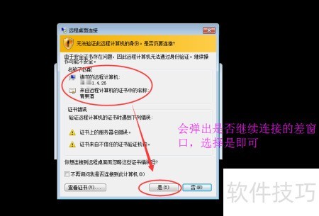11、 远程桌面连接时,弹出提示窗口选择是继续。