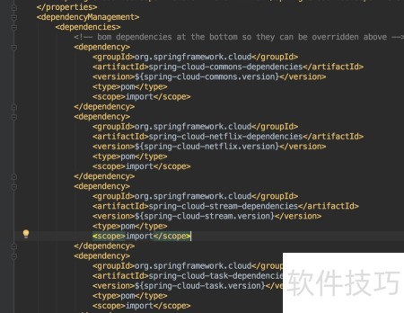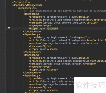4、 在继承 Spring Boot 版本依赖后,若需引入 Spring Cloud 相关依赖,则无法通过继承方式直接使用 Spring Cloud 的版本管理。此时应采用 dependencyManagement 中的 import scope 方式,将 Spring Cloud 的 BOM 导入项目,从而统一管理其各组件的版本,确保依赖兼容性与项目稳定性,避免版本冲突问题。