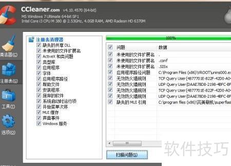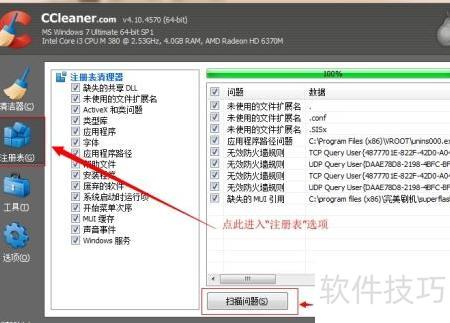 5、 使用CCleaner清理注册表时,先在左侧选择注册表选项,然后点击扫描问题开始检测。待扫描完成后,点击修复所选问题,随后选择不备份并直接进行清理操作,具体步骤示所示。