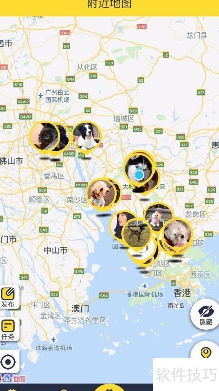 6、 该定位器应用支持发布寻宠信息,发布后蓝灯闪烁并启动追踪模式。界面简洁,功能丰富,还可结识附近狗友,分享宠物照片与视频,方便实用。