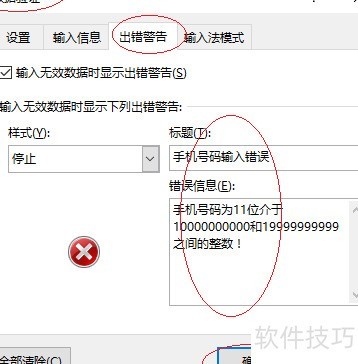 6、 设置出错警告为停止样式,在标题和错误信息框中输入提示内容。