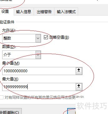 5、 在数据验证设置中,选择允许整数,并设定最小值与最大值范围。