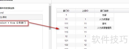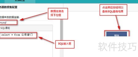 4、 在大数据展示工具的数据连接下拉框中,选择此前创建的MySQL连接,然后在SQL输入区域填写相应的查询语句,具体操作所示。