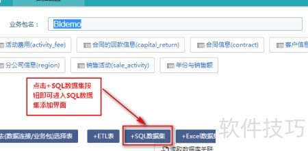 2、 在大数据展示工具BIdemo中,通过编写SQL语句创建的数据表称为数据集。进入数据配置下的业务包管理,选择BIdemo业务包进行操作,然后点击页面下方的+SQL数据集按钮即可添加新的SQL数据集,用于后续的数据分析与展示。