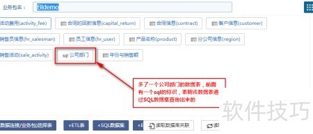 9、 点击下一步后进入大数据展示工具的数据表配置页面,在表名栏输入名称,如公司部门,然后保存。此时可在业务包管理界面看到该业务包中已新增对应数据表,具体效果所示。