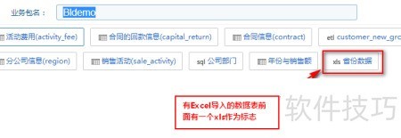 16、 点击下一步,返回大数据展示工具的表配置页面,在表名后的输入框中填写从Excel上传所得的数据表名称,如省份数据,随后点击保存。完成操作后,该数据表将出现在BIdemo业务包中,具体效果所示。