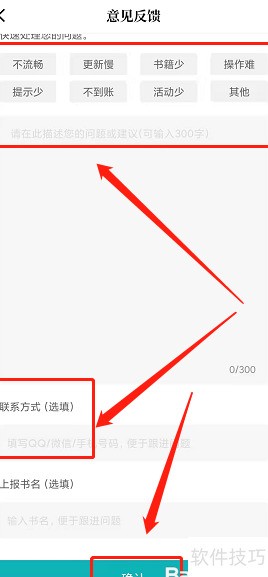 9、 进入反馈页面,选择类型,填写内容与联系方式后点击确认提交。