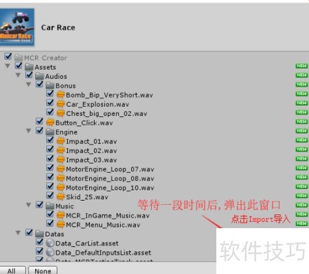 3、 资源加载完成后弹出窗口,点击导入按钮选择文件即可。