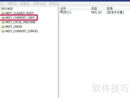 4、 打开注册表编辑器后,点击左侧的HKEY_CURRENT_USER根键进行选中操作。