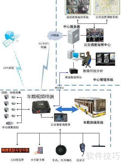 12、 车载前端系统由监控与调度两大子系统构成。监控子系统依托车载DVR主机,配合摄像头、拾音器及紧急报警按钮,实现对车内音视频及车辆GPS信息的采集与本地存储,并通过主机内置的无线通信模块将数据实时传输至管理中心。调度子系统以智能调度屏为核心,支持公交运行中的调度操作,同时可扩展连接车内外扬声器、刷卡设备、手持话筒、LED信息显示屏以及多媒体发布屏幕。该系统整合了传统的GPS定位、自动报站、视频监控、刷卡支付及媒体播放等多个独立系统,形成一体化平台。所有终端数据可通过统一通道上传至中心,也可接收来自管理平台的指令与内容更新,便于实现集中化管控,提升运营管理效率,并自动生成各类运营统计报表,为决策提供数据支持。