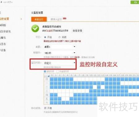 3、 第三,配置被控主机的云监控功能:需先完成身份验证方可进入设置界面,验证方式包括被控主机的Windows账户密码或客户端预先设定的访问密码。通过验证后,即可进入云监控设置页面。如第二张图所示,开启云监控功能,随后可自定义监控时间段、帧率及移动侦测灵敏度等参数,确认无误后保存设置,系统即按配置运行监控任务。