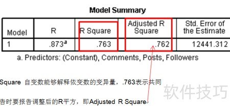 4、 R平方表示自变量对因变量变异的解释程度,此处0.763说明共同解释了76.3%的变异。在论文中应报告调整后的R平方值,即Adjusted R Square,以更准确反映模型的解释力。