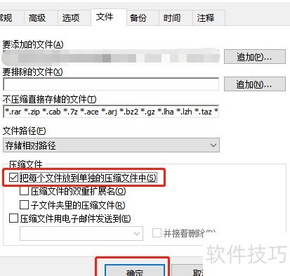 4、 打开所示界面,在底部选择压缩文件选项,勾选将每个文件放入单独的压缩包,最后点击下方确定按钮完成操作。