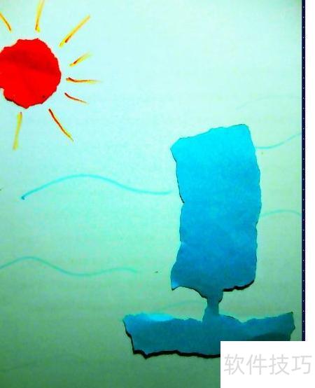 6、 把撕好的红太阳贴在底板纸上,用彩笔描绘光芒和水波纹。