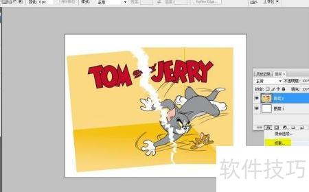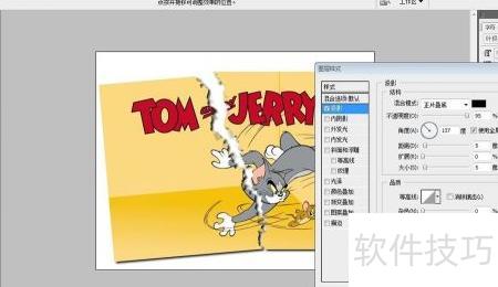 6、 接着按住Ctrl+T,将套索选中的部分图像移动,形成撕裂效果。为增强真实感,可在图层面板中添加投影样式,并调整相关参数,使撕裂边缘更具立体感和自然光影。