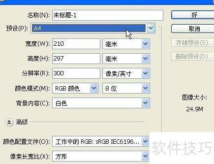 1、 启动Photoshop,创建一张A4尺寸的空白文档,具体操作所示。