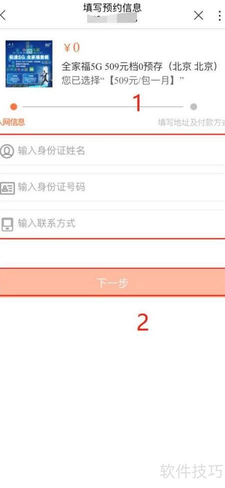 5、 进入预约信息填写页面,依次输入姓名、身份证号和联系电话,确认无误后点击下一步完成操作。