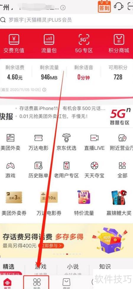 1、 进入联通APP,点击底部服务选项。