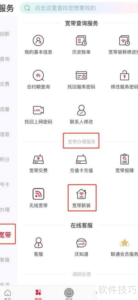 2、 进入宽带页面,选择办理服务,点击新装即可。