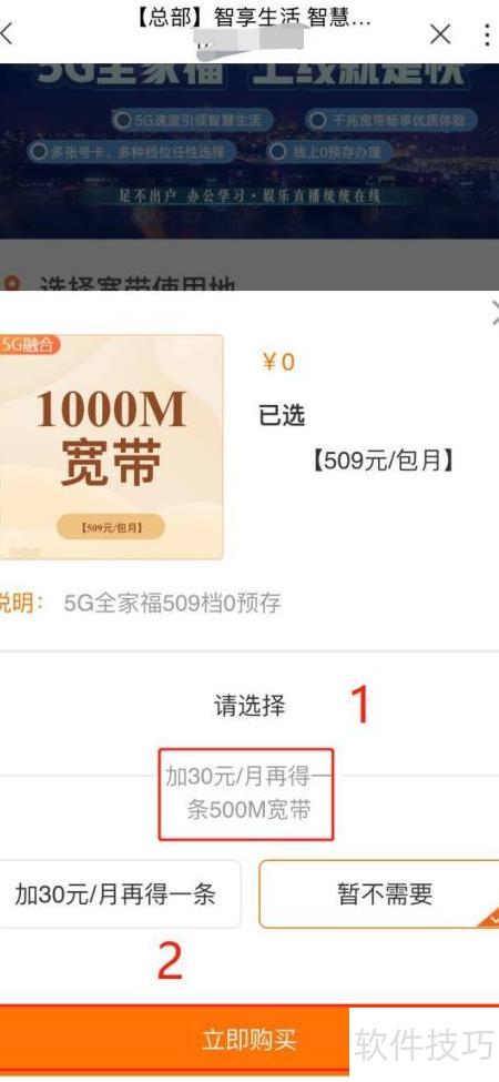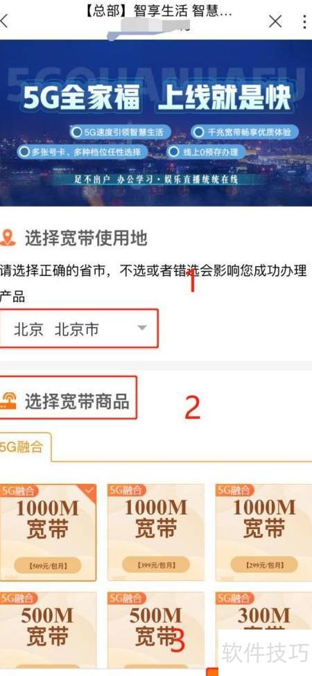 3、 进入办理页面后,选择宽带使用地区和商品,然后点击立即购买即可完成操作。