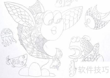 3、 画好主角后,为它设计一个故事:所有鱼见到会飞的鱼都羡慕不已,充满惊奇。接下来,让我们一起动手,把这些生动的鱼儿也画出来吧!