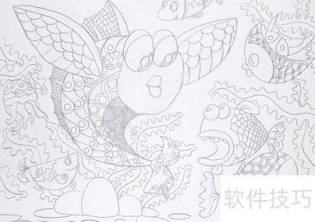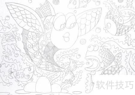 4、 在画面右侧已绘制若干元素后,为保持整体协调,可在左侧添加鱼、石头或水母等元素进行装饰与平衡。