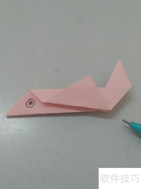 7、 在纸张左侧用铅笔画一个圆代表飞鱼的眼睛,再于圆内点一个小点作为眼珠,这样飞鱼的折叠就完成了。