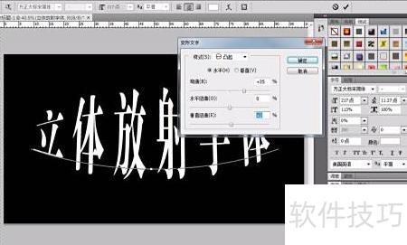 3、 使用上方工具栏中的文字变形功能,选择凸起样式,可调整下方各项参数,最后确认设置即可。