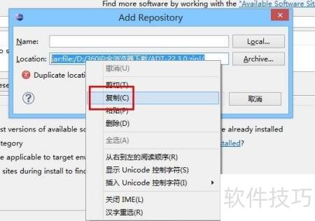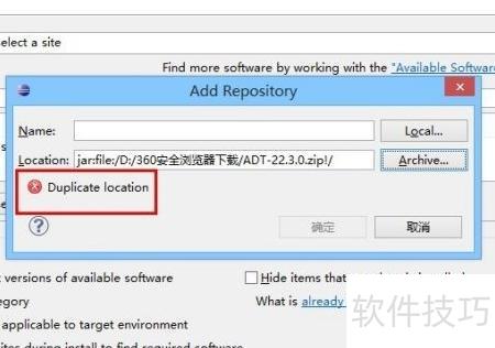 在使用Eclipse安装新软件时,有时会遇到duplicate location的提示。许多用户在配置安卓开发环境时,会通过Install New Software选项来添加插件,例如ADT插件。然而,即便操作正确,仍可能出现该提示。这通常是因为软件源地址重复导致系统无法继续。解决方法是进入可用软件站点设置界面,检查已添加的更新站点,删除重复或无效的URL,仅保留有效的地址,然后重新尝试安装即可顺利完成插件的添加过程。