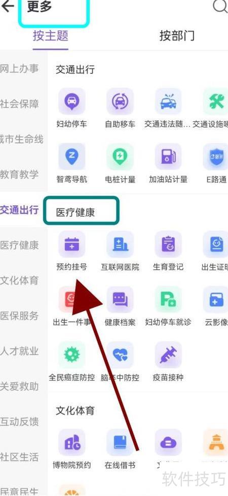 3、 进入更多页面,选择医疗健康,点击预约挂号即可查找。