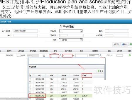 5、 点击炉号旁的放大镜图标,查看库存结存信息,选择所需炉号并提交,返回生产计划单页面后,系统自动填入可用数量,可在生产计划数栏中进行调整。