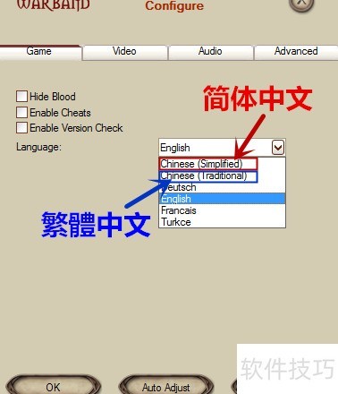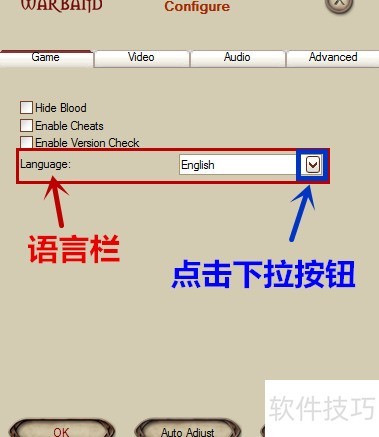 3、 在配置选项中找到语言栏目,点击右侧下拉箭头进行选择。