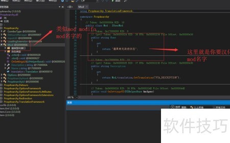 9、 将PropAnarchy拖入后展开程序集列表,查找名称类似ModModinfo或具体模组名称的程序集即可定位目标文件。
