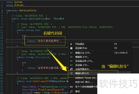 10、 以修改MOD名称为例,右键点击后选择编辑IL指令,即可更改双引号内的文本内容。