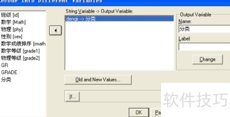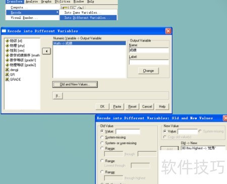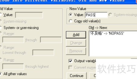 3、 可利用Recode过程对分类变量的多个类别进行合并。例如,将成绩等级中优秀良好和及格统一归为PASS类别,而将不及格重新编码为NOPASS,从而实现将原有多个水平整合为两个新类别,简化变量结构并便于后续分析与解释。