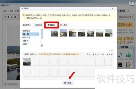 11、 撰写博客时,点击图片选项,选择已上传至图库的照片添加即可。
