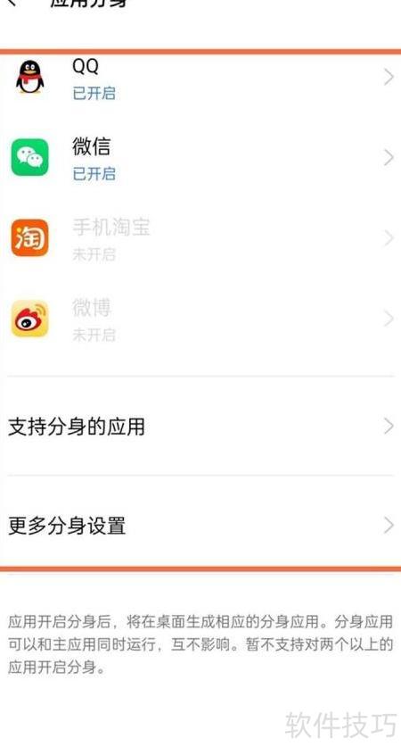 3、 选择应用并开启分身功能即可使用。