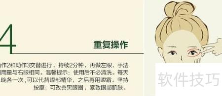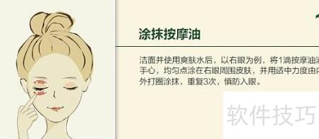 6、 洁面并用爽肤水后,取一滴按摩油于掌心,均匀点涂于右眼周,由内向外轻柔打圈按摩三次,注意避开眼部,力度适中。