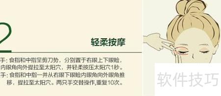9、 用左手食指与中指并拢,从右眼内眼角沿眼睑滑至外眼角,提拉至太阳穴,双手交替进行,重复十次。