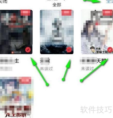 3、 在批量管理页面,点击书籍右下角圆点勾选,或按箭头指示点击全选,确认后点击底部删除按钮即可完成操作。