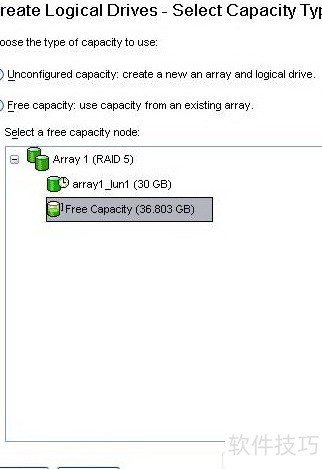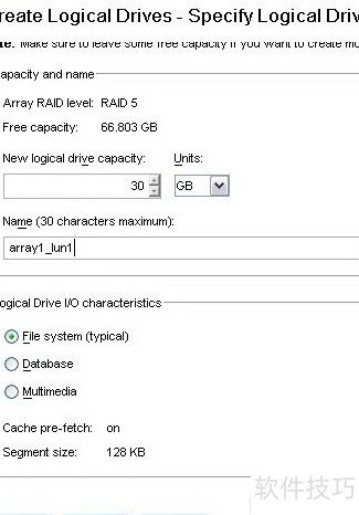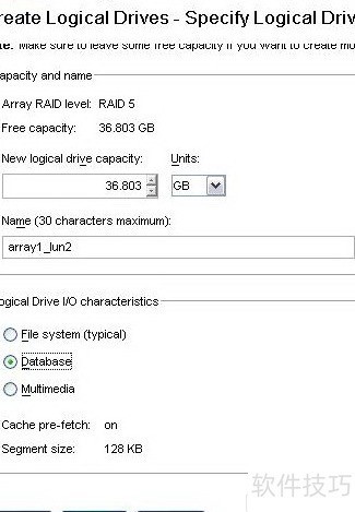 14、 在新建逻辑驱动器容量输入框中,输入所需创建的LUN大小(默认为原始阵列容量),随后根据实际应用类型选择合适的段大小(15所示)。