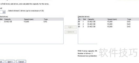 13、 选择三块硬盘组建RAID5,必须点击calculate计算容量后,才能继续进行配置操作。
