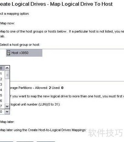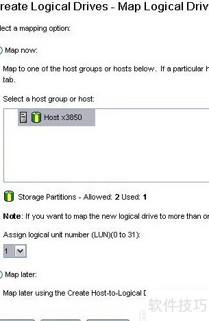 15、 选择在文档初始阶段创建的主机,指定一个LUN(在未启用分区许可时,每个分区内最多可创建32个LUN),16所示。