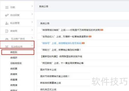 1、 登录微网站后,从左侧菜单进入互动型应用,点击其中的微签到功能即可。