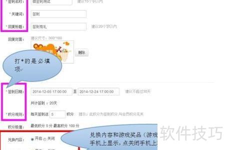 3、 设置杭州微巴微签到的名称与关键词,配置手机回复关键词后推送界面的标题内容,并设定签到成功后所获得的积分数量。