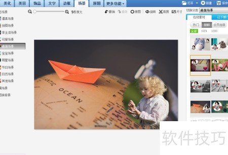 使用美图秀秀美化图片时,可通过添加背景功能选择桌面场景进行合成。