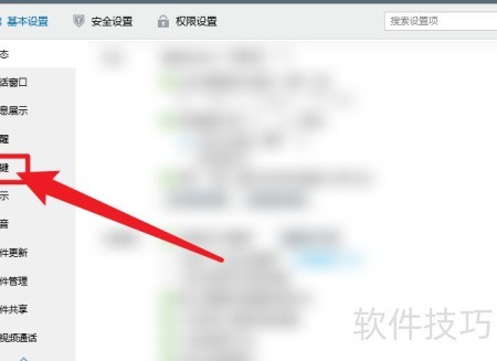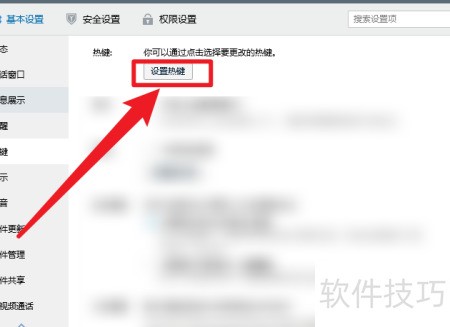 打开QQ软件,进入基本设置,左侧点击热键查看。
