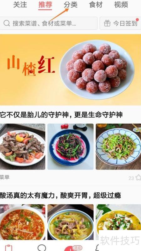 2、 进入菜谱页面后,点击顶部分类进行选择。