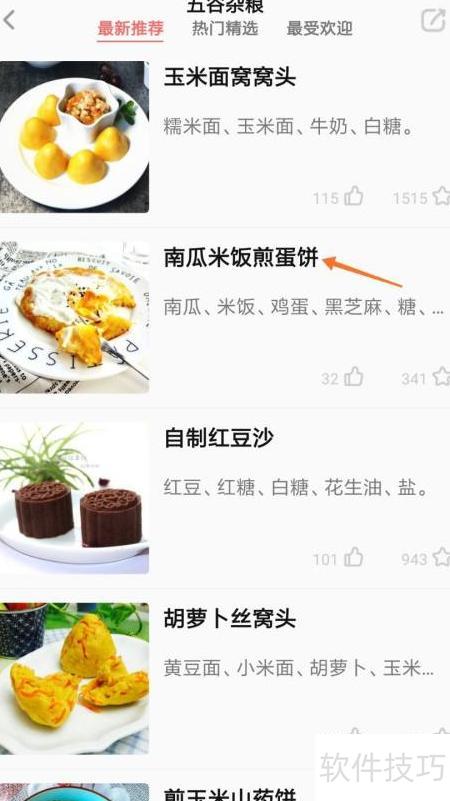 3、 在最新推荐列表中找到南瓜米饭煎蛋饼并点击,即可查看详情。